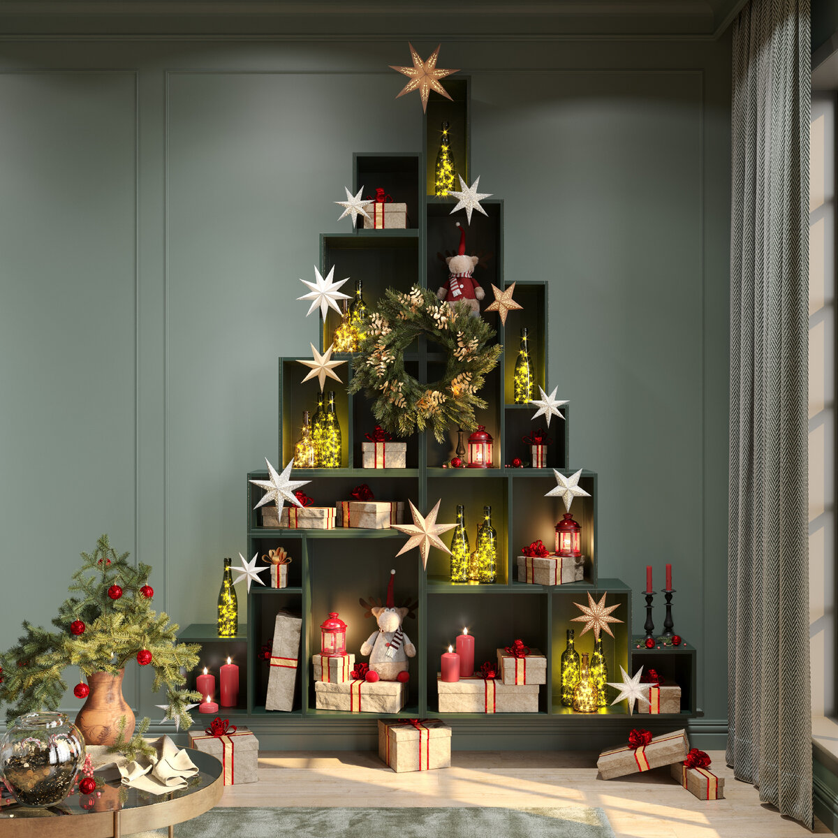 Используя гибкую светодиодную ленту, на стене или фасаде большого шкафа-купе можно «нарисовать» силуэт елочки, который будет эффектно светиться в темноте. Добавьте больше мерцания с помощью гирлянд, интерьерных фонариков и свечей.
