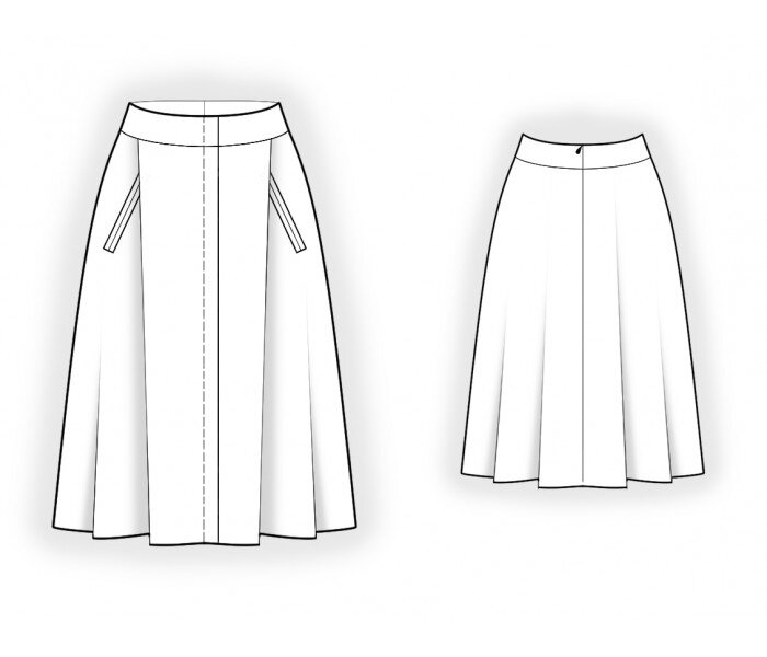 4. Заложить и закрепить по верхнему срезу косые складки на переднем полотнище юбки (глубины направлены к середине). Притачать внешнюю кокетку переда к переднему полотнищу, припуски заутюжить вверх. Сложить переднее полотнище по середине изнаночной стороной внутрь и стачать по намеченной линии. Полотнище развернуть, заутюжить складку на левую сторону.