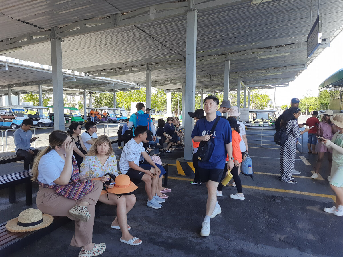 Тут же подбежали таксисты-водители электрокаров, начали предлагать свои услуги, но мы решили дождаться бесплатного автобуса. Тем более, что ждать было комфортно - на лавочках под навесом.