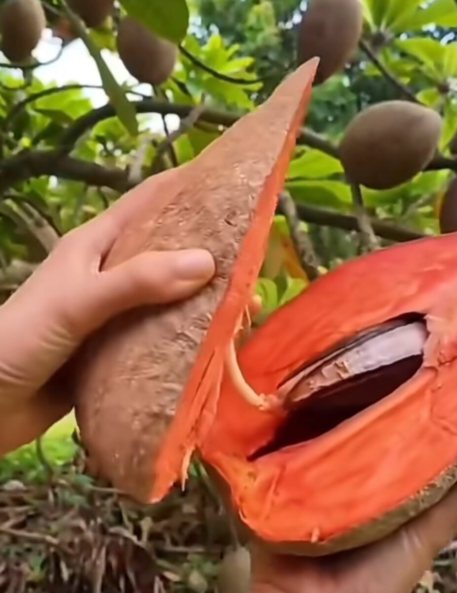 Вот такой необычный экзотический плод. Если встретите в магазине большие коричневые фрукты, на ощупь напоминающие наждачку, то потрите немного у основания, увидите оранжевую мякоть - берите не раздумывая. Правда, аллергикам нужно быть осторожными, экзоты всегда опасны.