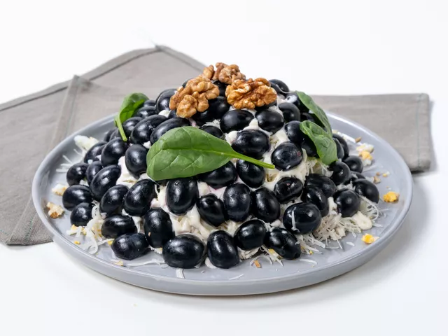 9. Выложите на салат половинки винограда и маслин, чередуя их между собой.