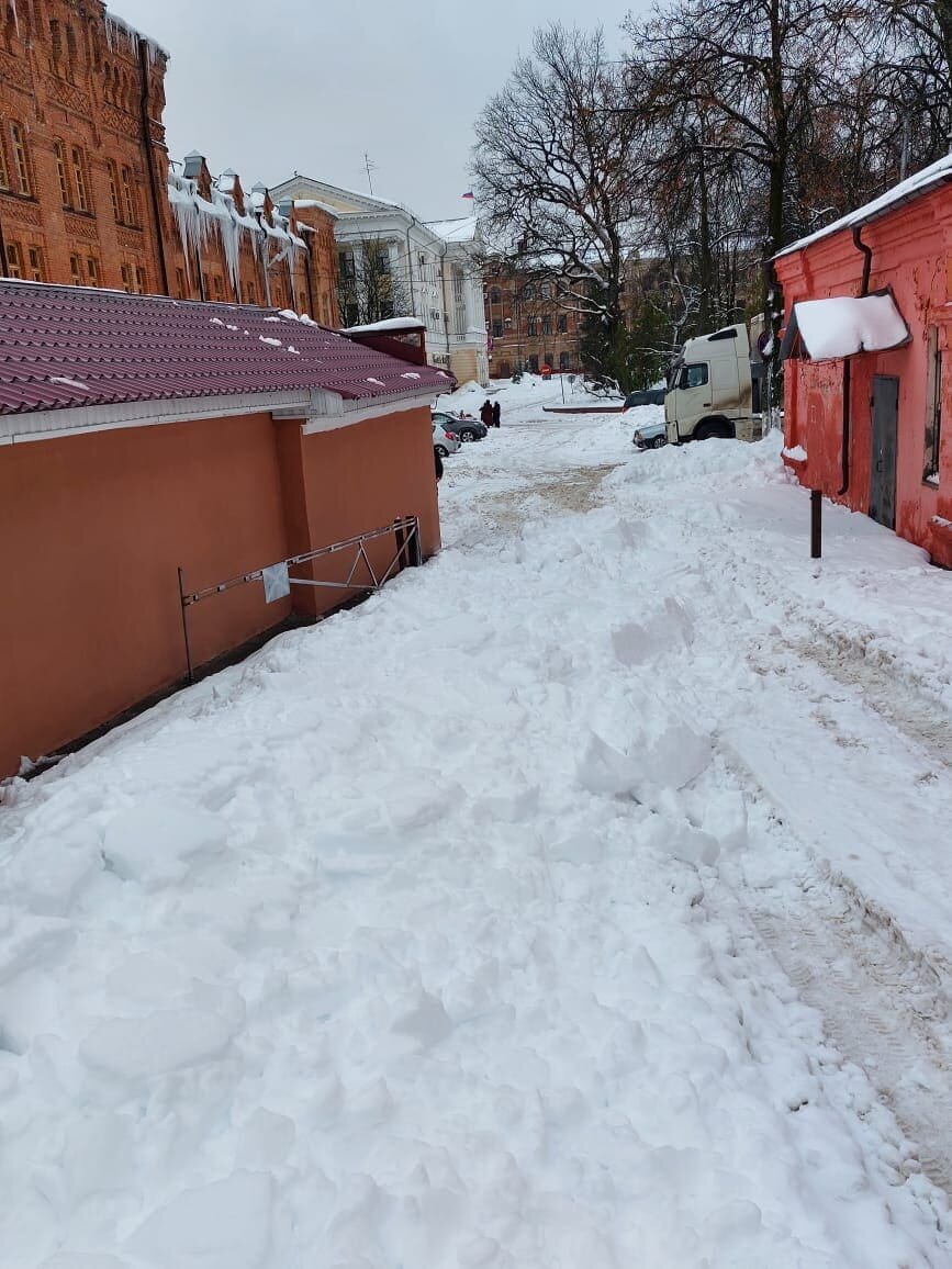 День назад мы рассказывали, напомним, о невообразимом снежном безобразии, которое допустил в самом центре Брянска, у здания Советской районной администрации ее молодой глава Денис Семенов. В расположенный за властным учреждением двор нескольких многоквартирных домов оказалось невозможно заехать со стороны площади Карла Маркса из-за огромного количества снега. Туда ведет достаточно узкий проход-проезд, шириной всего в полторы машины.