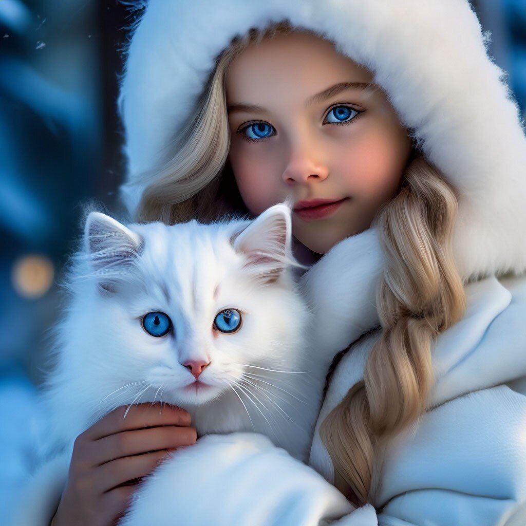 Девочка в белой шубке и с пушистым белым котенком на руках шла по заснеженному парку. Вокруг все было покрыто белым покрывалом. Деревья, скамейки, дорожки, даже воздух был белый от снега. Девочка остановилась на небольшой полянке и начала рассматривать её. Она была покрыта снежными кристаллами, которые блестели на солнце. Котенок принялся прыгать и играть, а девочка наблюдала за ним. Вдруг девочка услышала тихий шепот. Она обернулась и увидела маленькую снежную фею. Фея была крошечной, её крылья были белыми и легкими, как снежинки. Она улыбнулась девушке и сказала: - Привет, я Снежная Фея. Я живу здесь, в этом парке. Девочка улыбнулась и ответила: - Здравствуйте, Снежная Фея! Я очень рада с вами познакомиться. Меня зовут Алиса. А это мой котенок, его зовут Снежок. Фея улыбнулась ещё шире и сказала: - Я знаю, что вы любите гулять по этому парку. И я решила подарить вам этот кристалл. Он поможет вам найти свою истинную любовь. Снежная фея протянула Алисе маленький кристалл, который