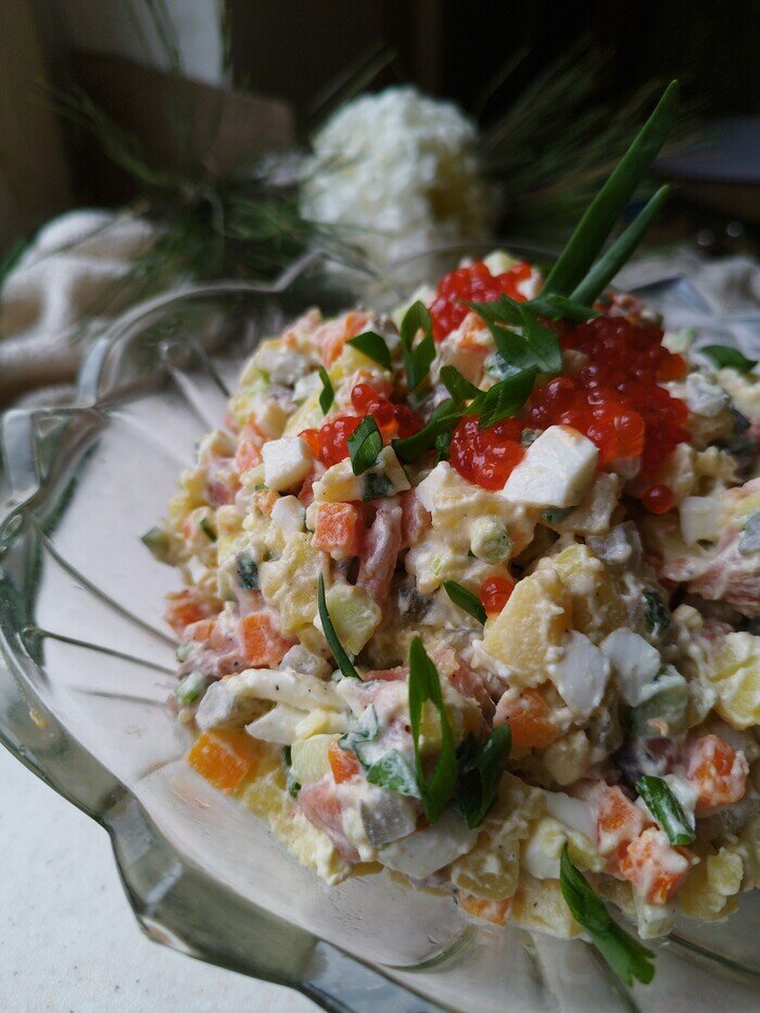 ДАНО: Деньги - 2000 руб. Человек взрослый - 4 шт. Задача: накрыть стол и вкусненько пожрать в новогоднюю ночь) Не буду тянуть кота за яйца - Второе новогоднее меню на 2000 руб. готово и лежит воооот ЗДЕСЬ. Что там внутри? Салат «Министерский» с красной рыбой и икрой. Салат слоеный с куриным мясом, гранатом и орехами. Салат с печенью трески курица, запеченная с грибами в сливочном соусе под сырной корочкой. Запеченная красная рыба на подушке из рукколы со сладким апельсином, свеклой и творожным сыром. Закусочные бутерброды с икрой и рыбой. Стоимость закупки – 2000 руб. Чеки можно увидеть в комментариях под меню. Давайте сразу оговоримся: стоимость продуктов актуальна для моего региона (Краснодар). А еще в этом меню есть предварительные приготовления, например - засолка рыбы. В общем - забирайте) Кстати, первое новогоднее меню ВОТ. Кстати, я говорила в одном из прошлых постов, что не люблю "Оливье". Кажется, рецепт идеального "Оливье" на мой мышиный вкус найден) Им и поделюсь с вами в эт