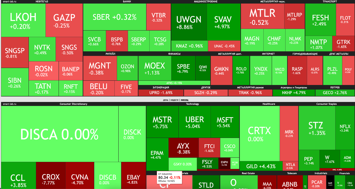 Рост российского рынка акций ускорился, экспортеры, вероятно, поддержали рубль 📈 В понедельник индекс МосБиржи повысился на 1,4%. Оптимистичный настрой инвесторов связан с пятничным решением Банка России поднять ставку лишь на 1 п. п. — некоторые участники рынка опасались еще большего повышения. Также оптимизма добавили рост цен на нефть и снижение доходностей российских гособлигаций. ЕС утвердил 12-й пакет антироссийских санкций. Он включает в себя ограничения на импорт непромышленных алмазов из России. 🔺 Американский рынок акций умеренно вырос. Хотя риторика главы ФРС Джерома Пауэлла по итогам заседания в среду на прошлой неделе была мягкой, некоторые представители регулятора заявляют о том, что пока слишком рано говорить о полной победе над инфляцией в США. 🇷🇺 Экспортеры, вероятно, поддержали рубль. В первой половине понедельника рубль дешевел и достиг 90,8 за доллар. Однако на этом уровне резко увеличились продажи иностранной валюты, и рубль укрепился на 1% примерно до 90. Вер