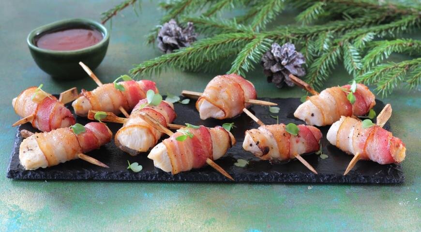Для приготовления нам понадобится: Куриное филе - 2 шт. (крупное) Сырокопченый бекон - 200 г Сыр - 150 г Сушеный чеснок - 1 ч.л. Соль, перец - по вкусу Приготовление: 1. Куриное филе разрезать вдоль. Одно крупное филе разделить на 3-4 части. 2. Хорошо отбить филе, чтобы оно стало тонким и хорошо свернулось в рулет. (По вкусу можно добавить к курице соль и черный перец). 3. Сыр натереть на мелкой терке. Положить на край филе и завернуть рулетик. 4. Обернуть рулетик в бекон. Для крупных кусочков лучше использовать две полосочки бекона и оборачивать немного под наклоном, чтобы обернуть филе не только по центру, но и вдоль всего рулетика. 5. Выложить в форму. Желательно чтобы рулетики лежали плотно, так они выйдут более сочными. 6. Сверху поспать сушеным чесноком. 7. Запекать 30 минут при 180 градусах. Далее еще 10 минут при 200 градусах. Благодаря бекону ,курица получается очень сочной и ароматной. Приятного аппетита!