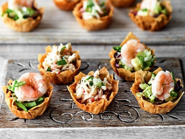 1. С красной рыбой: творожный сыр+лист салата+красная рыба+ломтик огурца, украсить кунжутом. 2. С креветками и авокадо: крем из авокадо (авокадо+лимонный сок+творожный сыр+соль и перец по вкусу, пробить блендером)+обжаренная креветка+помидоры черри+руккола. 3. С сыром и мидиями: твёрдый твёрдый сыр+чеснок по вкусу (через пресс)+майонез+мидии (в масле)+ ломтик огурца, украсить зеленым луком. 4. С икрой: творожный сыр+икра+долька лимона. 5. С крабовым паштетом: крабовое мясо+ творожный сыр + зелень укропа + соль перец по вкусу измельчить погружным блендером, украсить зернами граната и зеленью. 6. С печенью трески: печень трески+ отварные яйца+ тертый сыр+ майонез+ зелень. 7. С ананасами и ветчиной: ананасы+ветчина+ твёрдый сыр (все нарезать кубиками)+чеснок через пресс+ майонез, украсить зеленью. 8. С тунцом: консервированный тунец+отварные яйца размять вилкой+помидоры кубиками+зелень по вкусу+творожный сыр. 9. С копченой скумбрией: филе копчёной скумбрии+ творожный сыр+ лимонный сок+ с