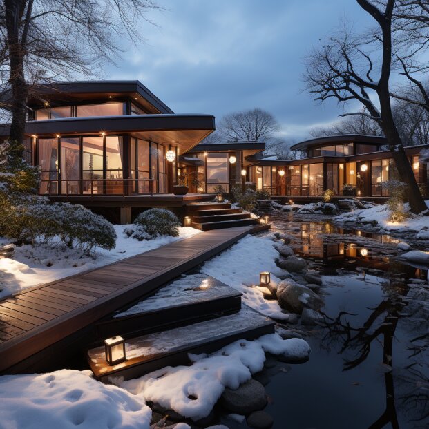 Выходим из дома в сад, идем в зону отдыха, из нее можно пройти к зоне кострища, а далее…