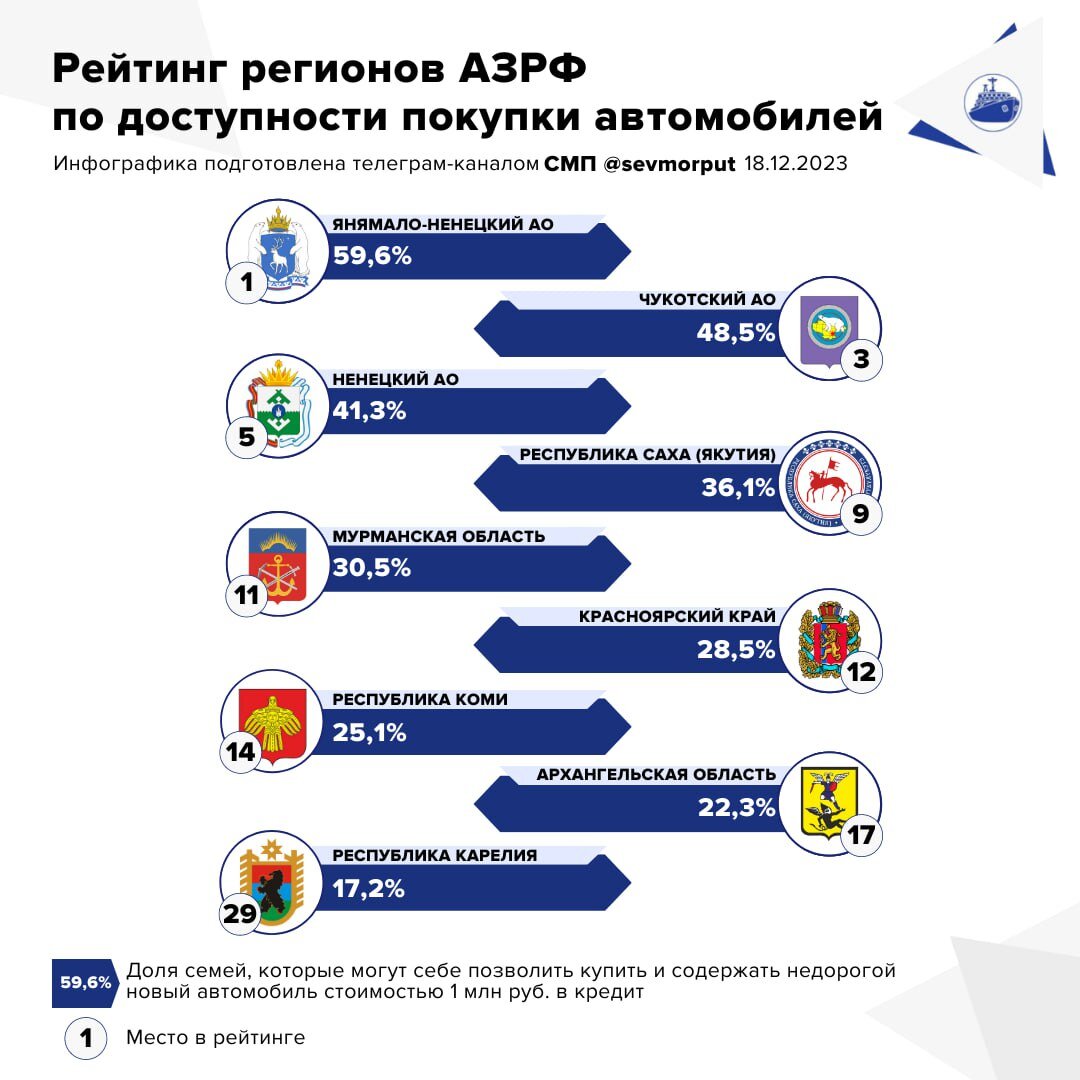 Регионы Арктической зоны заняли топовые места в общероссийском рейтинге доступности автомобилей. Доля семей, которые могут себе позволить купить и содержать недорогой новый автомобиль стоимостью 1 млн рублей в кредит, во всех регионах Арктики гораздо выше, чем в целом по стране (средний показатель — 18,9%). Исключением стала лишь Карелия.