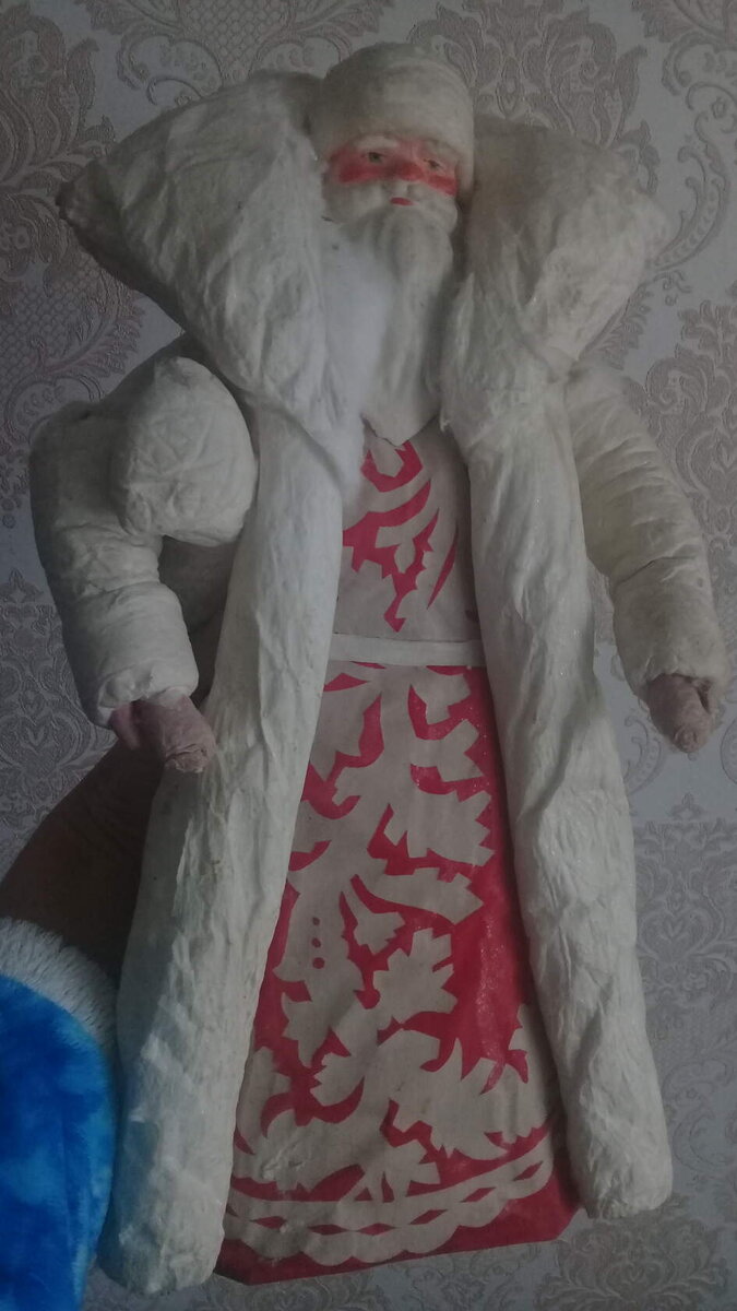 С этого красавца и началась моя любовь к ватным ёлочным игрушкам. Он всегда казался мне таким волшебным и я жалела, что у меня нет такого. Несмотря на "рваные раны" бабушка каждый год ставила его под елку. Я уже занималась ватной игрушкой но на его преображение не решалась. Боялась, что испорчу. Поднабравщись опыта, все-таки решилась. Вот таким он был. Всё ещё бравый, но слегка потрепаный Ну а маленьких ранок было нисчесть. Сперва я кисточкой смахнула слюду, что бы покрыть ей дедушку потом. Верхний слой походил на тонкую плёнку. Поэтому я спокойно терла его детскими не сильно влажными салфетками. Дедушка становился чище, но некоторые места не желали оттираться и я аккуратно срезала тончайший верхний слой ножничками. Из дырочки у бороды достала немного ваты. У меня была своя, оо она отличалась по цвету, консистенции, вкраплениям. С мне нужно было что бы ранки были не заметны. Так вот эту самую вытащеную вату прикладывать на ранения и промазывала клейстером. Места и вправду стали неза