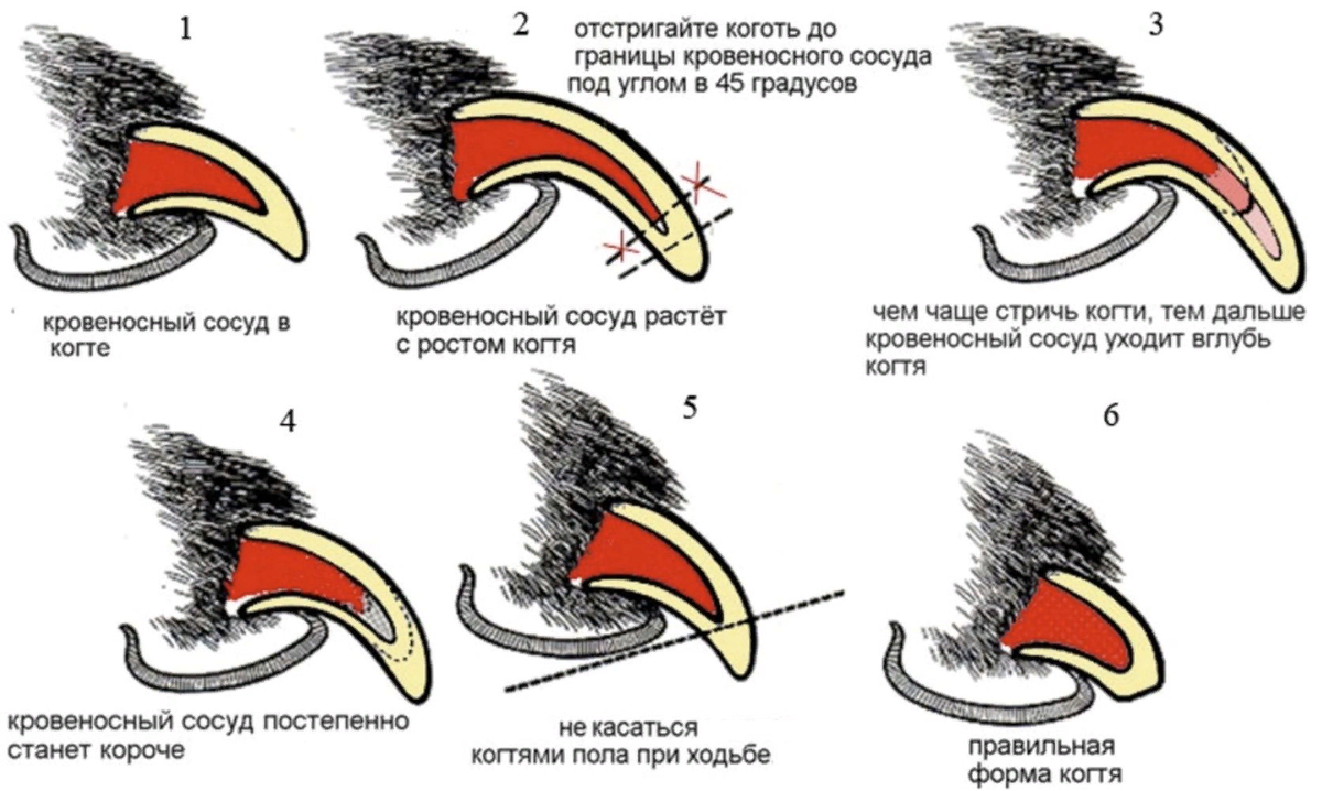 Пошаговая инструкция, как подстричь собаке когти Итак, как же подстричь когти собаке в домашних условиях? 1. Подготовьте собаку Для этого ни в коем случае нельзя играть с ней или как-то иначе возбуждать. Напротив, успокойте питомца, погладьте, скажите ласковые слова, угостите чем-то. Если собака плохо воспитана и может укусить, наденьте на нее намордник. И только, когда она полностью успокоится, можно приступать к стрижке. 2. Приготовьте специальную когтерезку Вам понадобятся специальные ножницы, которые, в отличие от человеческих маникюрных инструментов, не сдавливают коготь, а аккуратно его срезают. Приобрести такую когтерезку можно в любом магазине для животных. 3. Отрежьте самый кончик когтя Когти, особенно у собак крупных пород, малопрозрачные, поэтому определить на глаз границу чувствительного слоя трудно. Поэтому отрезайте аккуратно самый кончик когтя. Лучше потом повторить процедуру еще раз, чем причинить питомцу боль. 4. Действуйте быстро Обрезать когти на задних лапах лучше,