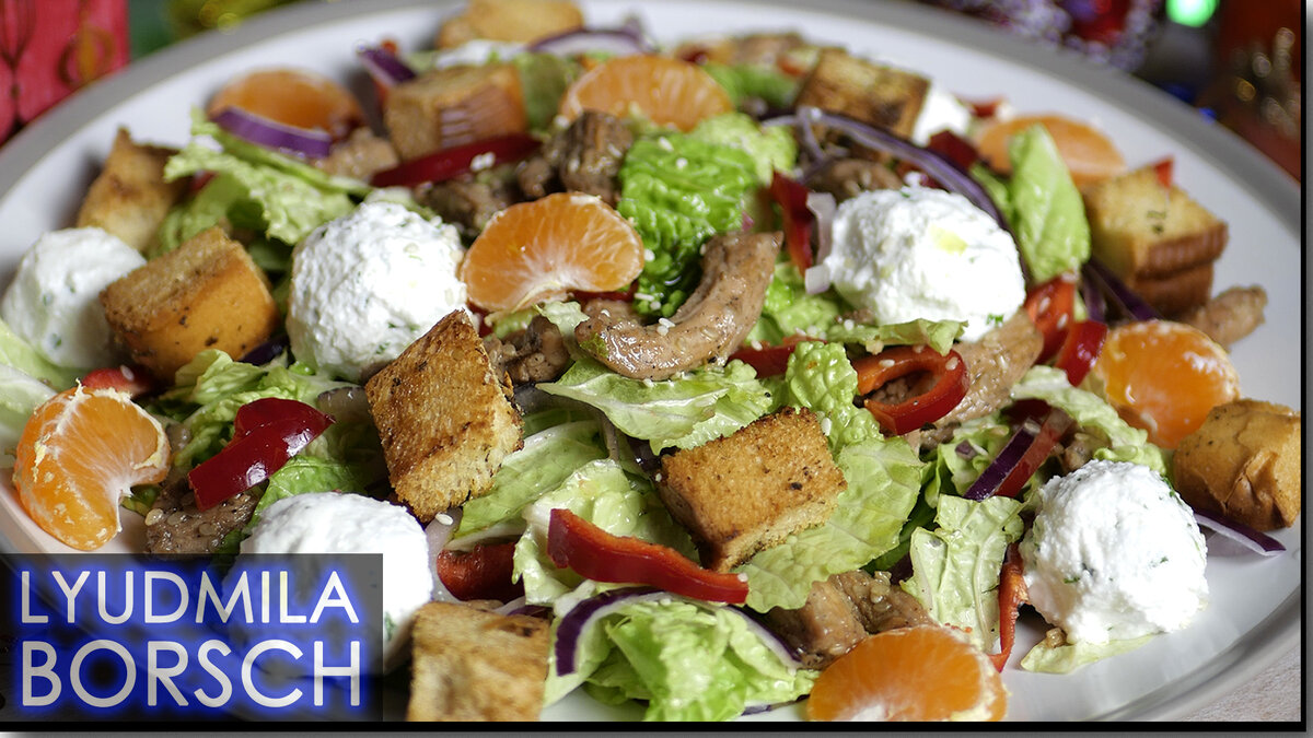 Этот салат с мясом и творогом представляет собой великолепное сочетание нежного творога и аппетитного мяса. Его элегантный вид и изысканный вкус сразу же привлекут внимание на праздничном столе. Он будет первым на Новогоднем столе, этот салат завоюет сердца гостей своей изысканностью и неповторимым вкусом. Батон нарезаем на небольшие кубики. Добавим чеснок. Прованские травы, соль. И оливковое масло. Хорошо перемешиваем. Отправляем в духовку на 10-15 минут. Мясо нарезаем тонкими полосками. Добавим кунжут, оливковое масло, соевый соус и перец. Оставляем на 30 минут. К творогу добавим зелень, чеснок и соль. Формируем шарики. Мясо обжарим до готовности. Лук и перец нарезаем полукольцами. Капусту рвем, добавляем лук, перец , мясо и перемешиваем. Для заправки соединим майонез, соевый соус, сок мандарина и перец. Майонез можно заменить сметаной. Выкладываем все на блюдо и заправляем перед подачей Этот салат представляет собой великолепное сочетание нежности и вкуса. Его элегантный вид и изыск