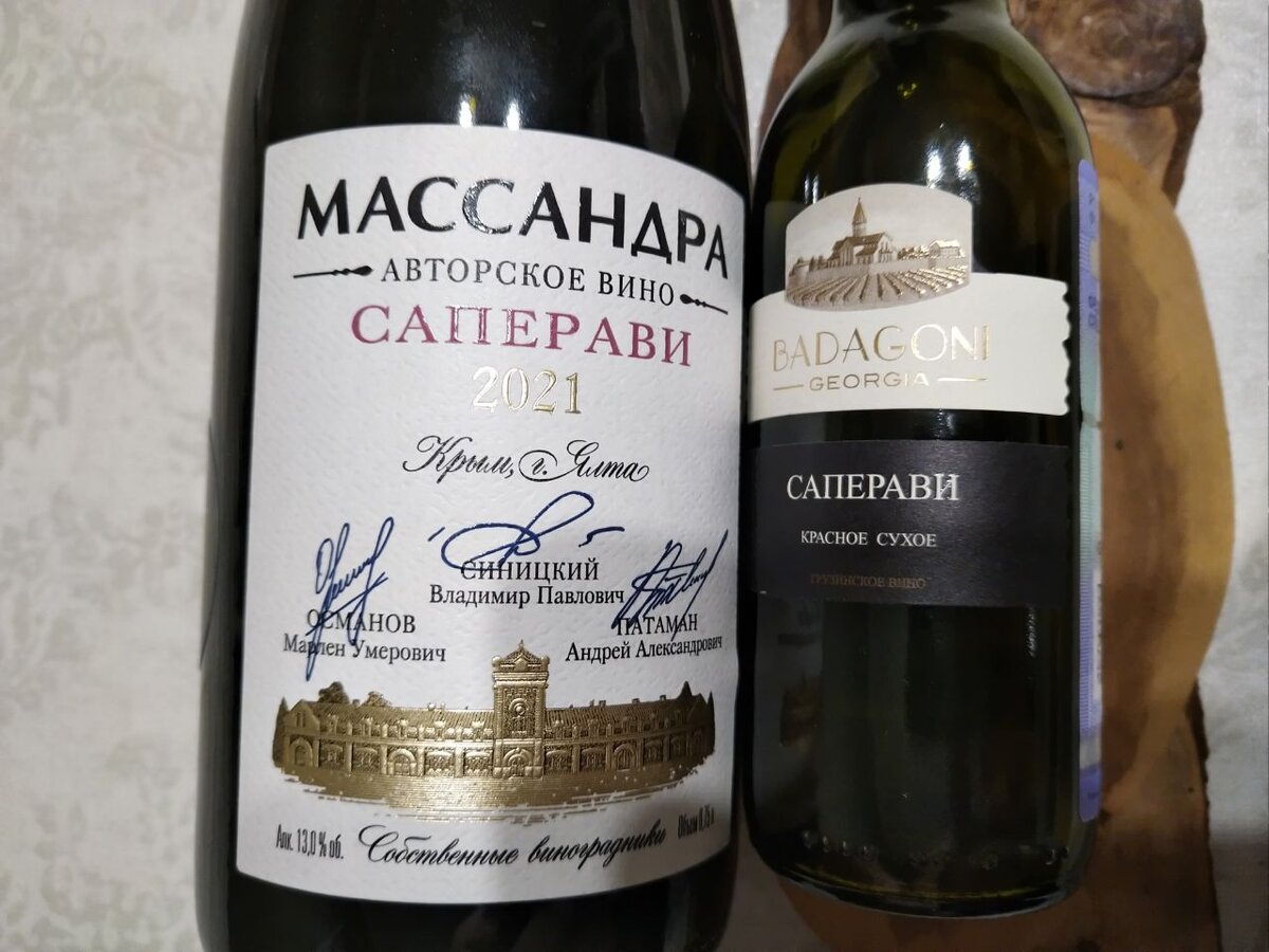 Современная «Авторская» серия моносортовых вин «Массандры» вышла в этом году широким ассортиментом: каберне-совиньон, саперави, кефесия и сира, если мы о красных. Пару лет назад был мурведр (сорт такой), который я оценил высоко, но то, вероятно, была другая серия, этикетка там была цветная. А тут этикетки одинаковые. Первым делом я пробовал вино из кефесии и несколько разочаровался, тем более в сравнении с отличным мурведром прошлых лет. Пришла очередь саперави. Напомню, что вино обошлось в 650 рублей в фирменном магазине «Массандры» в Алуште. Это с учётом скидки. А полная цена вина 850 рублей. Оно доехало на материк и сейчас продаётся, например, в Глобусе в ту же цену. Для сравнения возьмём саперави с родины сорта. Бутылочку Badagoni объёмом 0,187 литра (1 бокал) купил за 250 рублей специально для сравнения. Оба вина 2021 года урожая. Крымское вино с полимерной пробкой, грузинское с винтовой. «Массандра. Авторское». Первый вдох – как будто ваниль, потом активный напор чёрной смородины