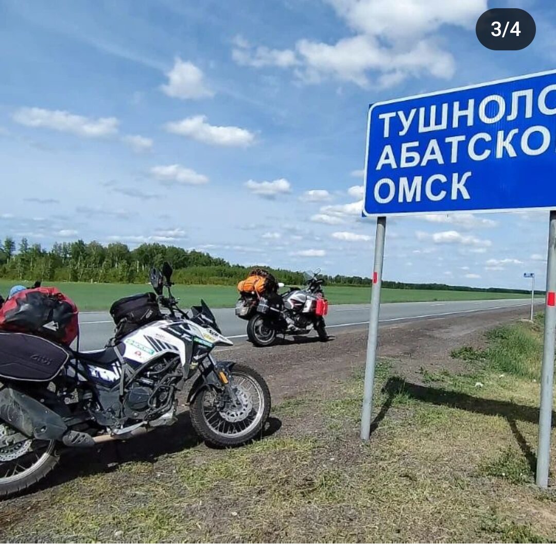 Часть 6 Выехав, абсолютно без всяких похмельных симптомов, из Тобольска, я обречённо направился в сторону трассы Тюмень - Омск. Ещё в прошлом году, по пути на Алтай, я воспринял ее, и далее весь путь до Новосибирска, как неизбежное зло. Двухполосная дорога, постоянная игра в шашечки с фурами, куча насекомых, забивающих визор и ветровик и исключающая(для меня по крайней мере) ночёвки в палатке. Ко всему этому, ближе к Омску прибавляются сильные боковые ветра. Причем если ветер с обочины то это ещё куда ни шло, едешь себе в постоянном наклоне и ок. Но вот когда он дует со стороны встречки, то каждая встречная фура на мгновение прерывает поток ветра, а затем отвешивает тебе смачную оплеуху, чуть не вышвыривая с дороги. В общем не люблю я эту дорогу))) Не доезжая Омска познакомился с греческим мотопутешественником Константином Митсакисом. Едет в Магадан на SYM 300 и пишет обзор на него заодно. Он стоял на обочине, я ехал мимо, остановился спросить не нужна ли помощь, а он возьми и ответ
