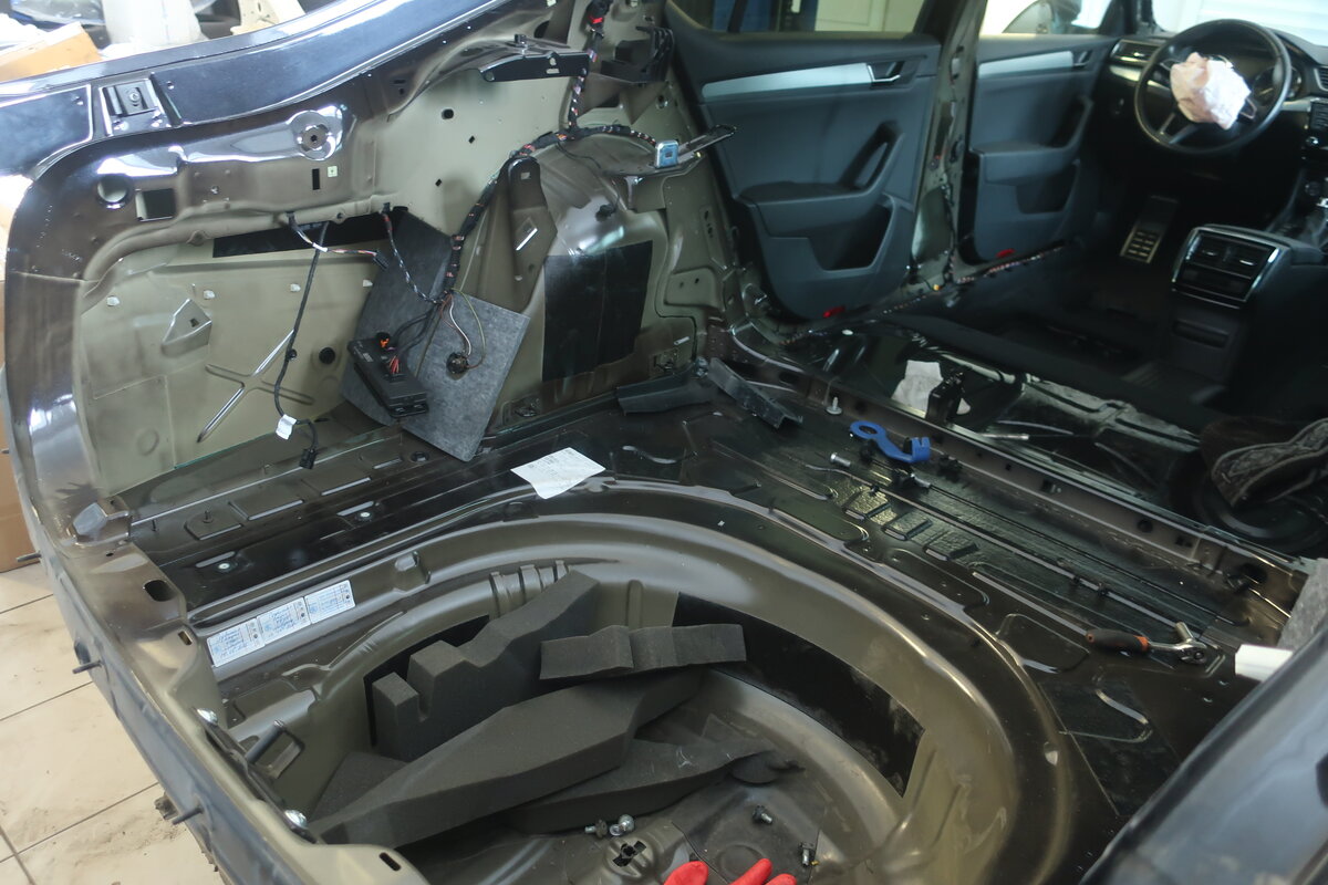 Пока ещё в начальной стадии разбора в гараже стоит чешский флагман - Шкода Суперб 3 поколения, но уже есть немало интересного, что было обнаружено в процессе демонтажа некоторых деталей и элементов. Что касается шумоизоляции, а также внутренней отделки, которая скрыта от глаз пассажиров, я обязательно сделаю полноценный обзор, а пока что покажу некоторые интересные моменты, которых ранее не встречал ни в одном автомобиле. Как видите, процесс разборки идёт, хоть и не так быстро, как мне того хотелось бы, есть немало других дел, которые тоже требуют внимания и времени, поэтому на Суперб не всегда находится свободная минутка. Тем не менее, некоторые детали уже сняты, частично разобран салон и багажный отсек, сняты некоторые обшивки, сиденья, а также потолок. И вот при демонтаже некоторых декоративных элементов в багажном отсеке, я наткнулся на один интересный электронный блок, который ранее не встречал ни на одном из тех автомобилей, которые мне приходилось разбирать. Находится он под лев