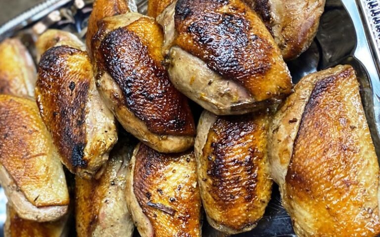 Это сытное и аппетитное блюдо несложное в приготовление и не требует много времени. И кстати, отлично подойдет и для праздничного стола, и для рядового обеда. Пропорции примерно следующие: на 2 шт. филейной части утиной грудки возьмём 2 ст. л. не засахарившегося мёда, 1 ст. л. соевого соуса и 1 ч. л. рисового уксуса. Дополнительно подсаливать не требуется, т.к. соль содержится в соевом соусе. Утиных грудки промываем холодной проточной водой, слегка обсушиваем бумажным полотенцем. Делаем на коже неглубокие крестообразные насечки надрезы, не достигая мякоти филе. Мед перемешиваем с соевым соусом и уксусом. Хорошенько на среднем огне разогреваем сухую сковороду с толстым дном. Поджариваем 6–8 минут грудки со стороны кожи, затем ещё минуту-полторы с другой стороны. Затем выкладываем их в огнеупорную форму кожей вверх. Сверху заливаем медово-соевой глазурью и помещаем в разогретую до 200 °С духовку на 15 минут. Готовьте с радостью и на здоровье!