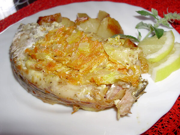 Запеченный карп, фаршированный овощами со сметаной – мой любимый новогодний рецепт. Эта простая рыба в таком исполнении становится настолько нежной и сочной, что ваши гости непременно попросят добавки. Поскольку у меня мужчина «неисправимый» рыбак, все время приходится придумывать все новые и новые рецепты для «утилизации» его добычи. Самый частый гость на нашем столе – это карп. Его мы просто обожаем: фаршируем, жарим, солим, ну и, конечно, запекаем... Если готовить рыбу целиком, то потом очень неудобно ее разделять на порции. Но недавно я нашла выход — запекая карпчика порционными кусками, но так, что на противне рыбка совершенно не потеряла своей целостности... Попробуйте этот удивительный рецепт и вы останетесь в восторге! Ингредиенты: Приготовление: Рыбу тщательно выпотрошите, помойте, нарежьте порционными кусками. Посолите, поперчите, приправьте приправой. Выложите кусочки на противень, смазанный маслом, имитируя целую рыбу (я при нарезании тщательно следила, какой кусочек за кот