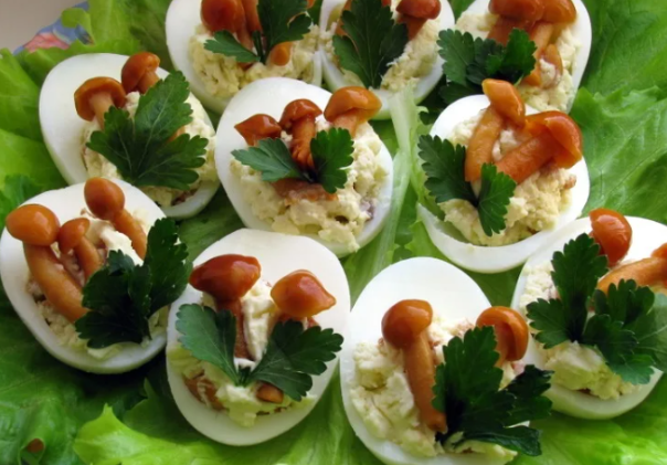 Практически ни один новогодний стол не обходится без закусок. В канун праздника многие хозяйки "живут" на кухне, столько всего нужно приготовить к праздничному столу. В этой статье представлены 3 простых, быстрых и вкусных вариантов закуски, которые украсят любой праздничный стол. Фаршированные яйца с маринованными опятами Отвариваем яйца, чистим, разрезаем пополам, удаляем желтки. В отдельной тарелке разминаем вилкой желтки. Добавляем майонез. Можно добавить твердый или плавленный сыр. По желанию - измельченный зубчик чеснока. Полученной массой фаршируем белки. Украшаем маринованными опятами, петрушкой или любой другой зеленью. Для красоты можно выложить закуску на листья салата. Грибная полянка Нам понадобится: Дно тарелки украшаем зеленью. Нарезаем огурец кружочками, раскладываем на тарелке. Натираем мелко сыр и крабовые палочки. Заправляем майонезом. Перемешиваем и лепим из них "ножки для гриба". Шапочку делаем из маринованных грибов. Новогодние шарики Натираем мелко плавленый с