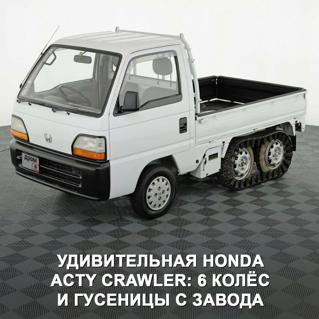Познакомьтесь с Honda Acty Crawler! По данным СМИ, всего Хонда собрала около 120 таких машин, они предназначались для работы в суровых горных условиях. Техника: → 3-цилиндровый мотор 0,6 л на 38 л.с. (54 Нм) и МКПП-5 с понижайкой. → Привод — 4х6, только одна из пары задних осей является ведущей, вторая соединена с ней гусеницами. → Есть блокировка дифференциала сзади. → Гусеничная система — сток с завода, для передвижения по асфальту их можно снять. На фото — один из этих грузовичков 1994 года с пробегом в 106 000 км, который попал в США и сейчас продаётся там за $26 500, или около 2 400 000 ₽. Интересно, такие привозили с аукционов к нам? 🤔 #дромновость #аукцион #honda #acry #6колес