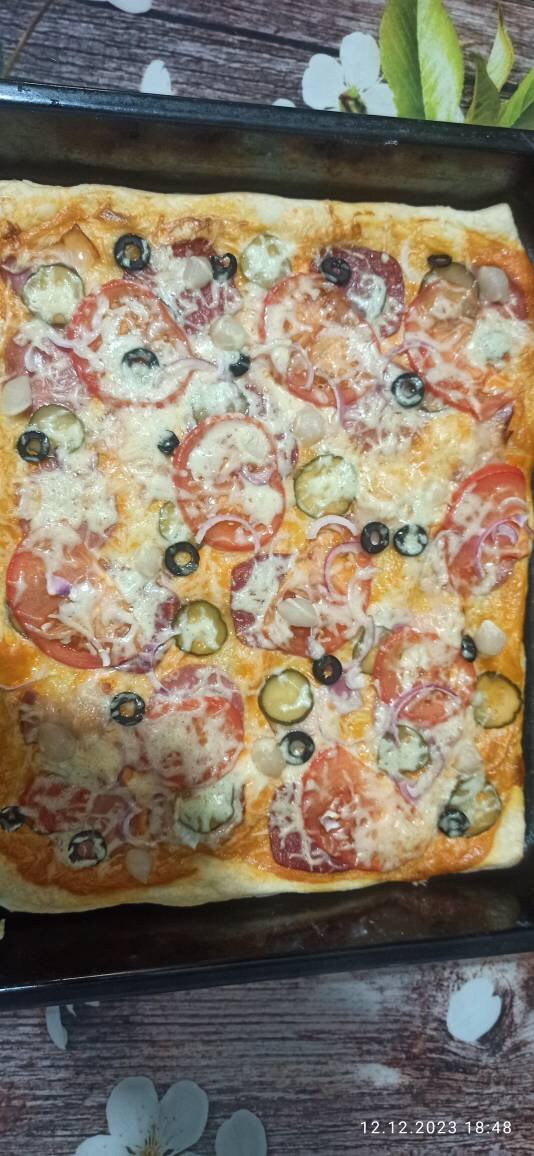 Домашняя пицца Ингредиенты слоеное тесто(у меня покупное), помидоры, соленые огурцы, оливки, колбаса, сыр, салатный лук, каперсы, бекон. Для соуса майонез, сметана и кетчуп. Тесто раскатываем ложим на противень и прокалываем вилкой. Далее смешиваем сметану, майонез и кетчуп и смазываем тонким слоем тесто. Затем выкладываем бекон и колбасу, далее помидоры и огурцы, оливки, каперсы, далее обильно посыпаем тертым сыром. И отправляем в духовку при температуре 400 градусов на 20 минут. Вуаля пицца готова режим на кусочки и подаем на стол. Приятного аппетита!!!