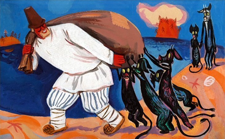 Когда для человека высшей ценностью становится сытость, он теряет разум. Символом такого состояния души мне видится пушкинский Балда (который идёт, сам не зная, куда). Казалось бы, человек сильный, работящий, но все его труды направлены на материальный достаток. Кто такой поп в этой сказе? Разум. Но разум грубый, стремящийся к упрощению, неспособный к глубокому осмыслению вещей (толоконный лоб) - отсюда его беды. Поп ходит по базару - разум ищет жизненные пути. Как жить, к чему стремиться, каким смыслом наполнить свою жизнь, чтобы прожить ее не зря? И находит Балду (само имя уже о многом говорит). Мало того, что находит Балду (сытость как смысл существования), он еще и расплатиться за это хочет хитрым способом. За сытость и достаток поп готов перенести небольшое символическое унижение - три щелчка по лбу. По сути Пушкин в своей сказке показал три уровня бытия человека: собственно, человек (поп), чревовек (Балда) и мудовек (черт). Итак, человек решил расплатиться за жизненные