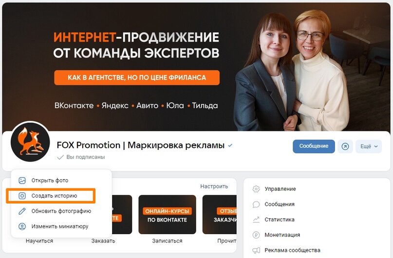 Истории можно добавлять как на личной странице, так и в Сообществе ВК.