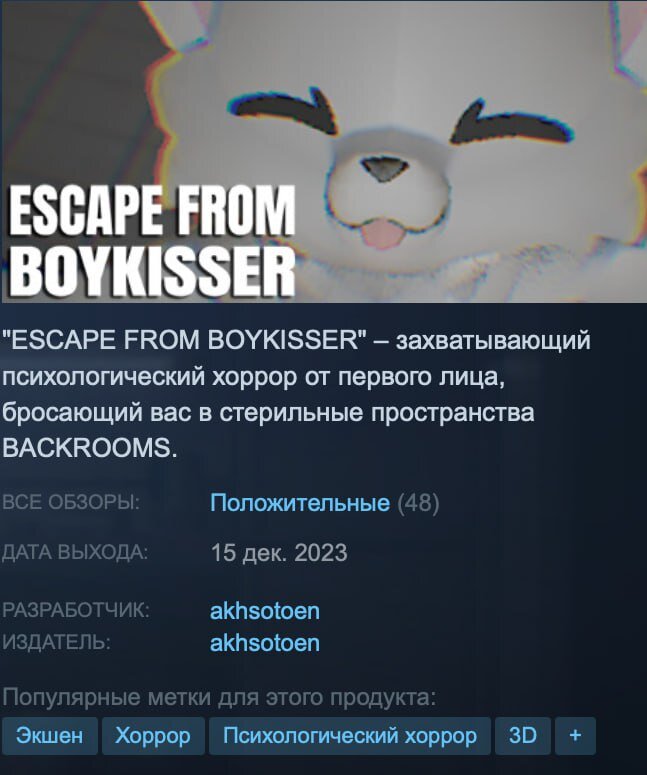 В игре нужно решать загадки при исследовании лиминальных пространств и избегать встречи с «целующим мальчиков» фурри. Самое страшное, что игра набрала 80% положительных отзывов.