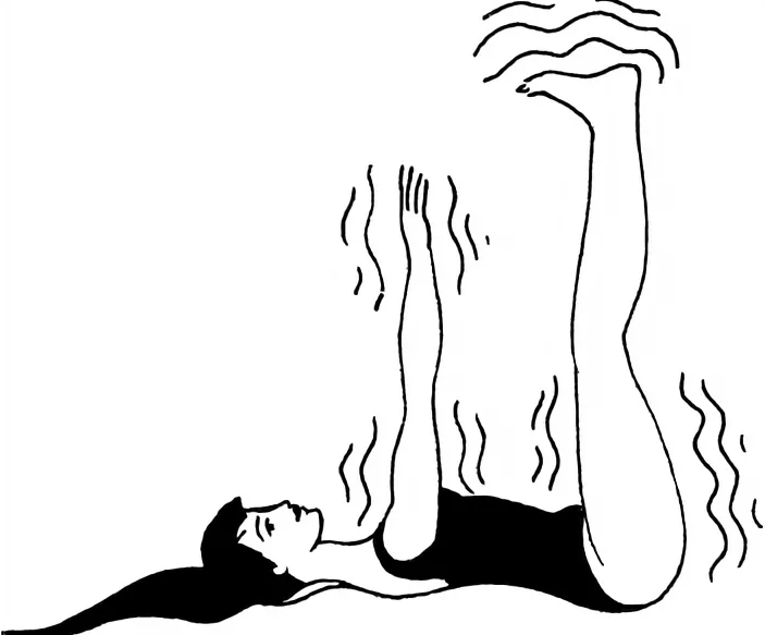 - Исходное положение - лежа на спине. Ноги и руки поднять в потолок. Трясем, упражнение - тараканчик. Трясем конечностями с любой комфортной скоростью, одновременно либо хаотично. Чувствуем вибрацию, это как раз то что нужно. Начните с 8 счетов. Со временем понравится, доводим до 2 минут.