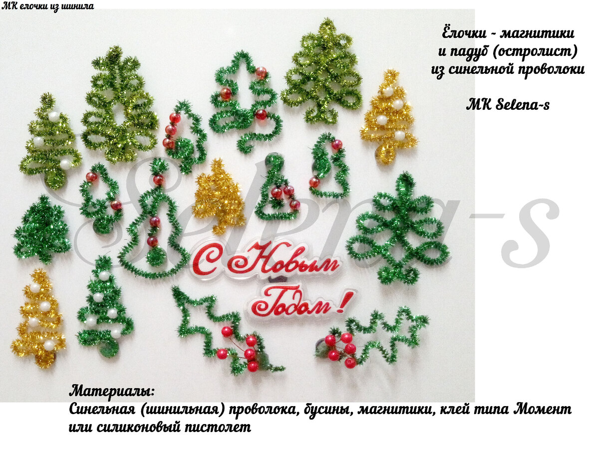 МК Ёлочки и падуб - магнитики на холодильник из синельной проволоки
