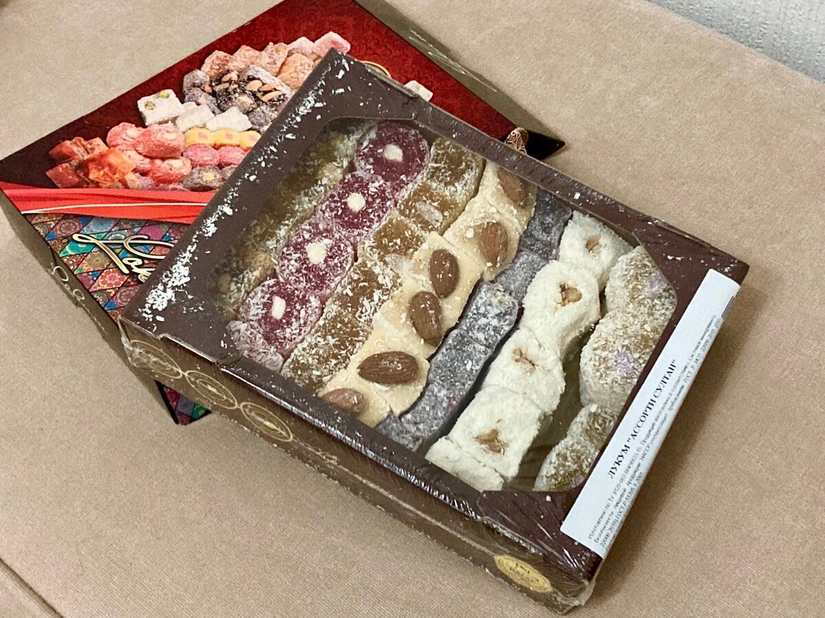 Бабушке мужа всегда дарим сладкие подарки. Пока что купили 800 г рахат лукум (артикул на ВБ: 148679247) и добавим что-то еще. Осталось еще его тетя, но она молчит.