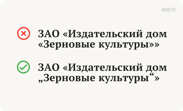 Самый сложный случай с кавычками — это прямая речь с цитатой внутри, когда приходится громоздить друг на друга две пары елочек. Или жертвовать одной из них. Или заменять одну из елочек лапками. Рассказываем, как нужно делать. Правильно: ЗАО «Издательский дом „Зерновые культуры“» Правило № 1 В рукописных текстах следует использовать кавычки-лапки, в печатных — елочки. Правило № 2 Если внутри сочетания, заключенного в кавычки, есть другие слова, тоже заключенные в кавычки, рекомендуется использовать кавычки разного рисунка: внешние — елочки , внутренние — лапки: Если нет технической возможности использовать кавычки разного рисунка, допускается возможность не писать вторую часть второй пары кавычек: Правило № 3 Перед закрывающимися кавычками не ставятся знаки препинания (точка, запятая, точка с запятой, двоеточие, тире). Они могут стоять только после кавычек. Вопросительный и восклицательный знаки (а также многоточие) ставятся перед закрывающимися кавычками в том случае, если относятся