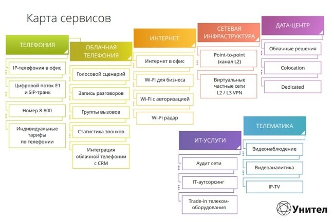 Унител работает на рынке телекоммуникаций Санкт-Петербурга и Ленинградской области свыше 11 лет. Компания оказывает услуги телефонии, облачной телефонии, доступа в интернет, организации сетевой инфраструктуры, дата-центра и colocation, телематики и IT. В портфеле у эмитента более 1100 клиентов, 90% выручки приходится на бизнес-клиентов. Стратегия развития компании включает: - подключение новых клиентов с окупаемостью до 2-х лет и валовой маржой 80%; - быстрый рост выручки за счет приобретения абонентской базы более мелких операторов связи с выручкой 36-60 млн руб. в год.; - стабильный доход в рамках подписанных крупных госконтрактов со сроками реализации до конца 2025 года; - органический рост за счет строительства собственной сети и привлечения новых клиентов в точках присутствия; - предоставление в аренду собственного оборудования. Компания занимает совсем небольшую долю рынка коммуникационных услуг региона, не превышающую 3%. Поэтому расти и развиваться в условиях жесткой конкуренци