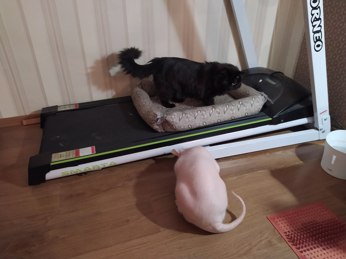 На звуки охотничьего рога подтягивается публика. И это не просто случайные прохожие. Это как раз та самая заинтересованная морда лица, поделившаяся с мачо частицей своего Я. Но - о чудо! В этот раз Её Величество совершенно не интересует, что там, в недрах под-тренажёрного пространства. Ну да, в былые времена Ночка и сама была не прочь утрамбовать туда десяток - другой мышей. А сейчас гораздо любопытнее наблюдать за бестолковой вознёй бройлера-переростка. "Терпением запастись ты должен, мой юный падаван. Не поймает лапа сама себя".