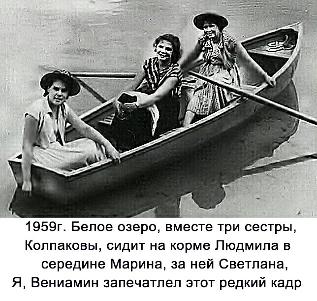 Лето 1959г. как всегда, отдых проводил на белом озере, проживая в пионерском лагере ;Учительский; иду вдоль берега в сторону посёлка. в это время, началось строительство пионер лагеря обувщиков, берег свободный, стоит армейская палатка, а на мостках сидит моя учительница по физике, в 12-й школе Колпакова Антонина Владимировна, подошел по мосткам к ней, какими судьбами Вы здесь, а Мы всей семьёй в палатке живём, начались воспоминания, время было за полдень из палатки выходят мужчина и три девушки, так Я, познакомился с Александром Михайловичем Колпаковым и его дочерьми. Мариной, Светланой, Людмилой. ( называю имена по возрасту). Так началась моя дружба с замечательной семьёй на долгие годы, Колпаков А.М. был директором вечерней школы, их было в городе, две второй школой руководил Сергей Ефимович Гонтарь, два директора известных на весь город математика.