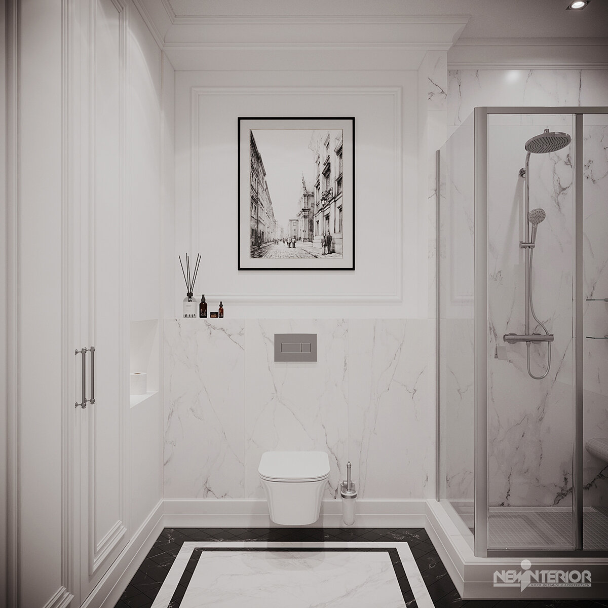 Визуализации интерьера ванной комнаты в проекте интерьера квартиры, расположенной в ЖК Собрание в Санкт-Петербурге. Это ванная комната с душем, именно с душем, а не с ванной. Так решили заказчики, а мы спроектировали сначала планировку, а потом интерьер. Это согласованный вариант, который появился он уже после того, как мы сделали утвержденный вариант санузла в этом же проекте. И поэтому здесь уже были применены некоторые похожие решения. Цветовая гамма чёрно-белая. На стенах вы видите сочетание покраски в белый цвет с керамогранитом, имитирующим натуральный камень. Чёрный цвет присутствует только в отделке пола, где сочетается керамогранит в разном исполнении. Также чёрный цвет есть в графике, которую мы разместили на стене над инсталляцией с унитазом, не бойтесь использовать искусство в таких помещениях. Хотя и напрашивался чёрный цвет в отделках сантехники, мы решили использовать хром. Главное преимущество такой отделки — её зеркальный эффект, благодаря которому предметы отражают ок