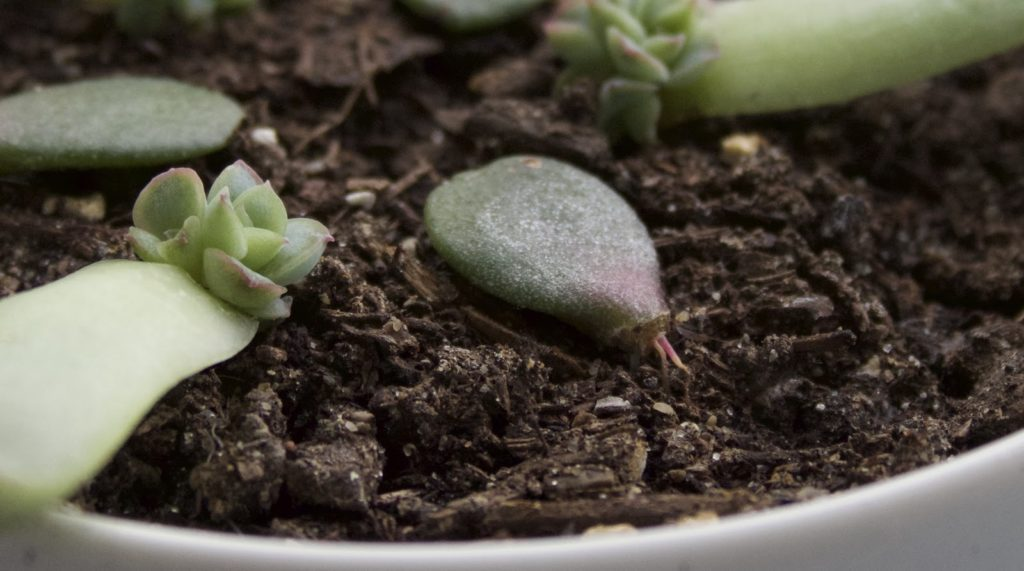 Иногда, суккулент сам начинает размножаться самостоятельно. Отпавший листок самостоятельно погружается в землю и начинает развивать свои корни. Важно своевременно отследить этот процесс и переместить отросток подальше, чтобы корневые системы обеих растений не переплетались. У некоторых суккулентов размер листка достаточно большой, поэтому нужно использовать не весь лист, а только его часть. Предвар