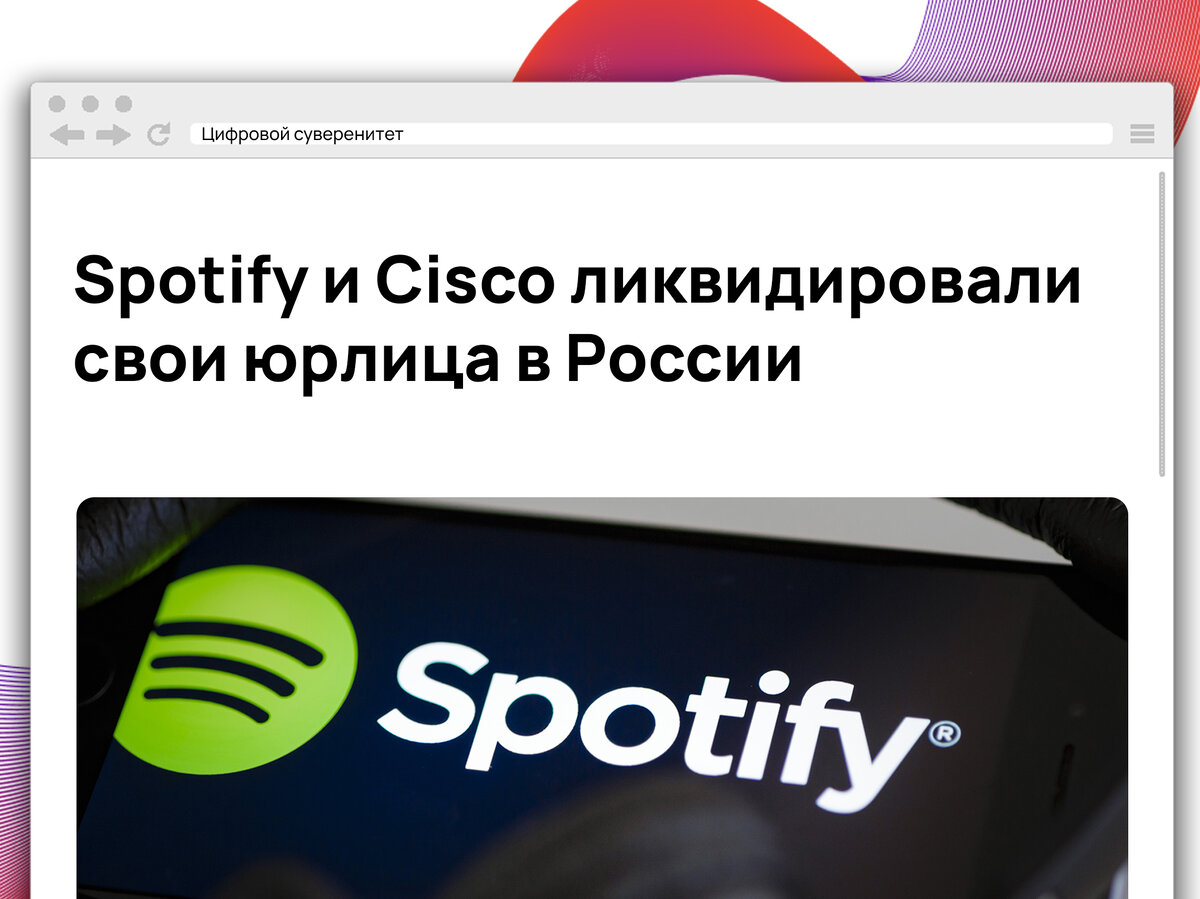 Музыкальный сервис Spotify и производитель сетевого оборудования Cisco объявили об уходе из России после начала спецоперации на Украине. ООО «Спотифай» было зарегистрировано в России 13 января 2014 года. 6 февраля 2023-го шведским сервисом было направлено заявление о ликвидации, а 14 декабря юрлицо Spotify было ликвидировано. Таким же образом, только с 15 декабря, ликвидировано одно из юридических лиц производителя сетевого оборудования и программных продуктов Cisco — ООО «Сиско системс», которое ранее занималось обслуживанием оборудования. Но у Cisco имеется второе юрлицо в России — «Сиско солюшенз», которое на данный момент действует. Его сферой деятельности является дистрибуция и продажи.