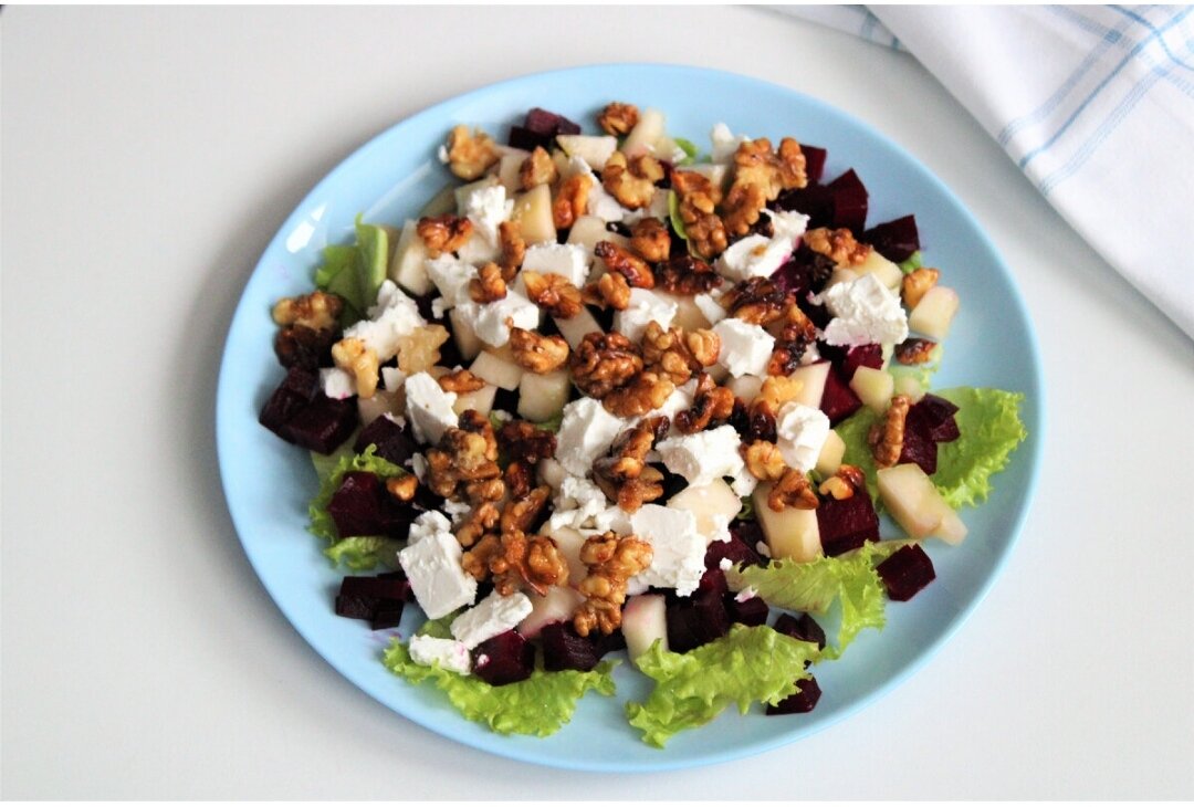 Как правило, этот салат съедается быстро и с удовольствием. И действительно сочетание продуктов весьма интересное и необычное, и такой салат непременно хочется повторить, именно поэтому все гости ушли домой с рецептом. Для приготовления этого салата необходимо заранее запечь или отварить одну небольшую свеклу. И подготовить орешки, все остальное нужно делать перед самой подачей. Орехи можно использовать грецкие или миндаль. Их необходимо хорошо промыть и подсушить в духовке. Далее отправляем на сковороду орехи вместе со сливочным маслом и сахаром. Обжариваем орехи с получившейся карамелью несколько минут и выкладываем на бумагу для выпечки, равномерно распределяя так что бы орехи не слиплись между собой. Пока орехи остывают можно подготовить свеклу и грушу. Их необходимо очистить и нарезать небольшими кубиками. Грушу нужно взять мягкую и вкусную, если такую купить не удалось, то можно перед тем как отправлять ее в салат обжарить на сливочном масле с добавлением сахара (как орехи). Со