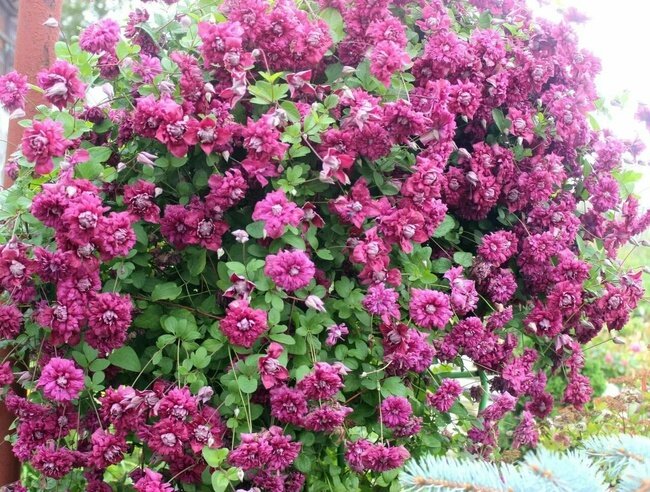 Необычный клематис Purpurea Plena Elegans с махровыми лепестками пурпурного цвета - одна из новинок этого сезона в нашем магазине. Небольшие цветки, что обильно усыпали куст с крохотной темно - зеленой листвой, привлекают огромное внимания так как очень непохожи на другие клематисы. В диаметре цветки могут вырастать от 4 до 6 см. У них есть еще одна отличительная черта, они растут на длинном стебле, как бы возвышаясь над кустом. Куст вырастает до 2, 5 м. Клематис - светолюбивое растения, но небольшая полутень ему не повредит. Сажают их с апреля по май. Также садить клематисы можно на зиму в конце сентября - октябре. Для посадки клематиса советуем выбрать плодородный, увлажненный суглинок. Избегайте засоленных и переувлажненных мест посадки. Глубина для посадки саженцев 50 - 60 и в большей мере зависит от размера посадочного материла. Место посадки нужно укрыть мульчей. Если вы правильно посадили растение, то в скором времени удивитесь, как оно быстро растет. Через 4 - 5 недель клемат