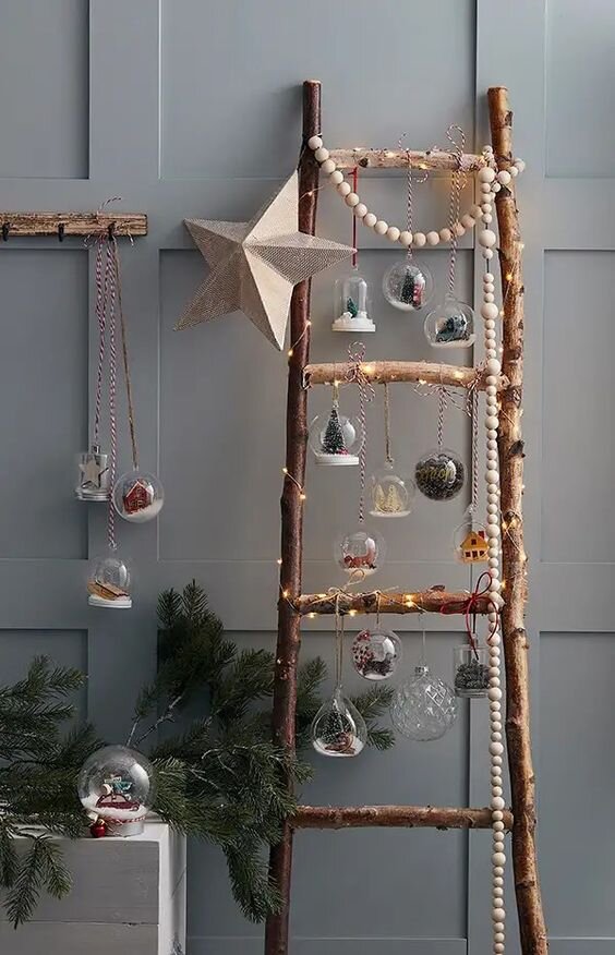 ЛЕСЕНКА-ЧУДЕСЕНКА Пройтись до ближайшей лесопосадки, парка, леса и принести две длинных палки (от земли до вашего плеча или чуть выше вашего роста) и несколько коротких. Чем кривее и сучковатей они будут, тем лучше. Принеся их домой, соберите при помощи джута или веревки из них подобие приставной лестницы. Для этого привязывайте «перекладины» крест-накрест. Как только конструкция будет готова, украсьте её крупными ёлочными игрушками — блестящими и матовыми, обвейте светодиодной нитью а батарейках. Такая фигура может даже заменить ёлку – настолько она празднично выглядит. Плюсы тоже есть: не будет осыпающихся иголок, будет больше свободного места. А ещё на этой лесенке можно развесить адвент-кадендарь для детей — маленькие сюрпризы в конвертах на каждый день декабря. ВАМ БУКЕТ Конечно, Новый год без смолистого аромата представлять не хочется, поэтому вот вам креативная альтернатива осыпающемуся дереву. Подберите большую приземистую вазу или плетёную корзину, и соберите в ней роскошную