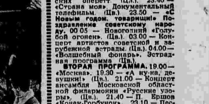 Это отличный фильм. Называется - "Волшебный фонарь". Ничего подобного на советском телевидении больше не было. На телевидении данный фильм демонстрировался всего два раза. Первый показ был 24 апреля 1976 года. В программу его поставили неожиданно. Основная версия - чтобы отвлечь народ от Пасхальной ночи. Режиссер Евгений Гинзбург получил выговор, когда оказалось, что фильм побил все рекорды по количеству "запрещенной музыки". Странно, но в новогоднюю ночь на 1977 год этот фильм был показан еще раз. А потом положен на полку. Можно предположить, что именно для показана в канун Нового года он и создавался, но чья-то блестящая мысль выкатила его на экраны в апреле. Вот кадр из программы за 31 декабря 1976 года. Видно, что фильм поставлен на показ в 4 часа ночи - для самых ответственных телезрителей, которые трезвыми досидели до утра: О чем же этот фильм? Это фильм-спектакль про кино. А вернее - большая пародия на популярные фильмы заграничные фильмы. В главных ролях сыграли самые изв