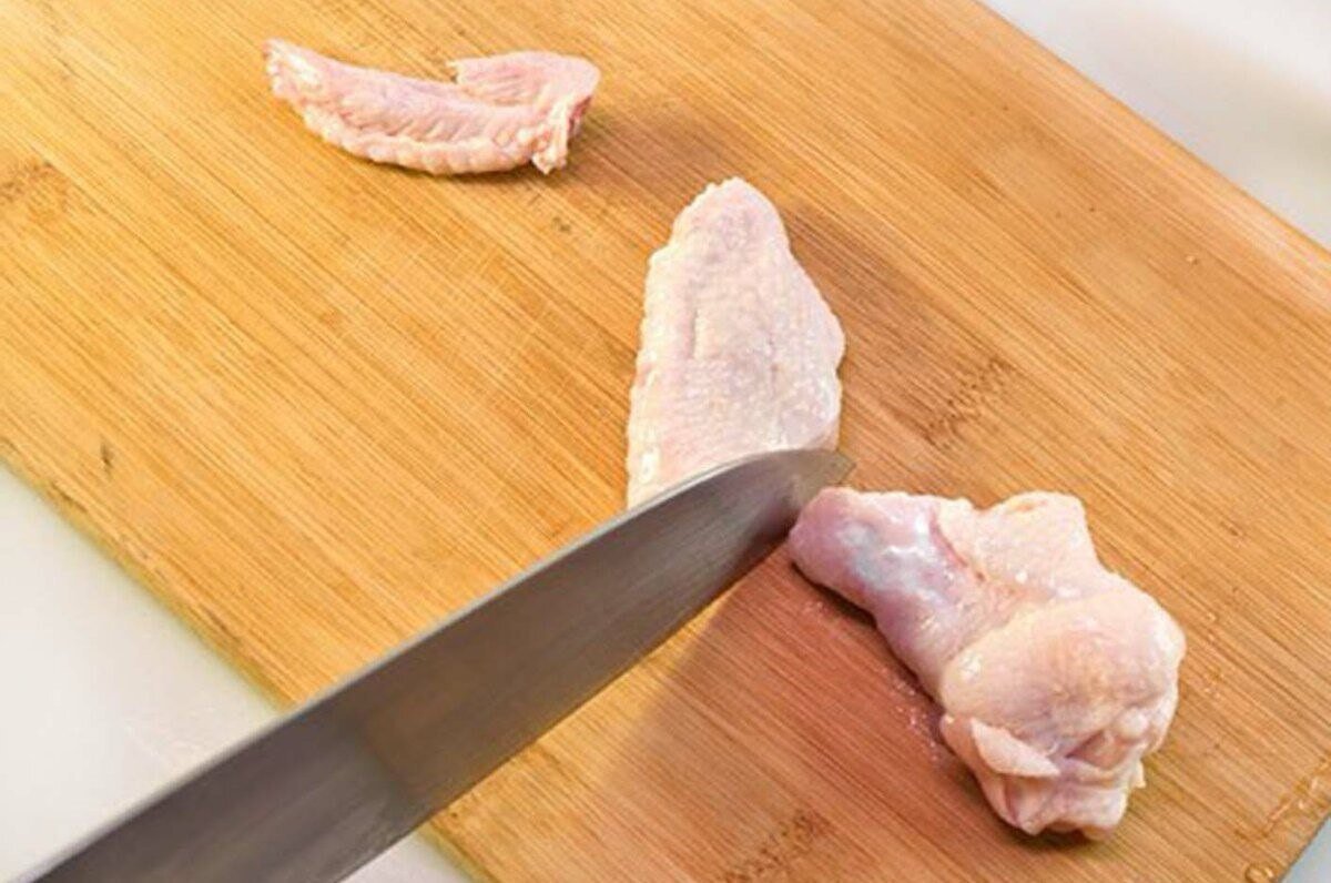 Для этого (извините за живодёрские подробности!) вывихните сустав между локтевой и лучевой частями, прокрутите и выгните назад кончик крыла до характерного хруста. Отгибайте сустав назад, пока не увидите оголенные кости. Меньшая из них соединена с кончиком крыла. Положите крыло на разделочную доску и острым ножом отделите локтевую часть от лучевой. Еще легче это можно проделать с помощью кухонных ножниц.