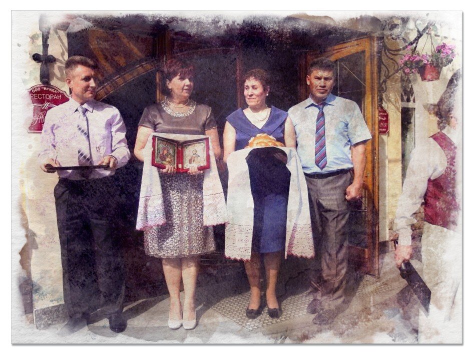 На пороге у входа в столовую стояли Макаровы и Стоцкие, встречая молодых хлебом солью и благословляя иконами. Рита и Иван вкусили угощение и поклонились родителям в пояс!