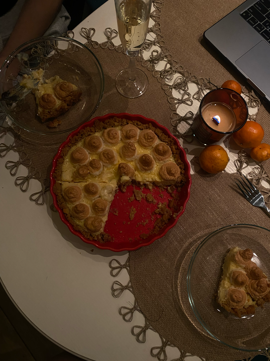 Традиционной сладости на Новый год не существует, поэтому для нас открыты все двери. Лимонный пирог с пиками из безе сможет стать вашим коронным блюдом на любом празднике. Лично мои ощущения, что он пропитан именно атмосферой "джингл белс" Нам понадобятся: Основа: 1. Печенье песочное - 350-400 г; 2. Сливочное масло - 200 г; 3. Ванилин - 10 г. 4. Щепотка соли. Начинка (лимонный курд): 1. Лимонный сок - 200 мл (2 лимона средних); 2. Яйцо - 5 шт.; 3. Сахар - 50 г; 4. Сливочное масло - 120 г. (предварительно вытащить из холодильника); 5. Сгущеное молоко - 100 гр. Безе: 1. Белки - от 4-5-х яиц (останутся после приготовления курда). 2. Сахарная пудра - 200 г. Этапы приготовления: 1. Печенье раздробить блендером или вручную разбить в пакетике через полотенце; 2. Сливочное масло растопить на водяной бане или в микроволновке; 3. Вылить масло в печенье; 4. Добавить ванилин и соль в смесь печенья и масла; 5. Все перемешать; 6. Взять форму для выпекания (как на фото выше) и выл