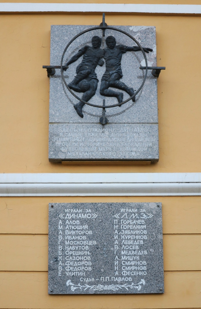 "На стадионе «Динамо» есть памятная доска, связанная с событиями блокады. Установлена она была в 1991 г. - архитектор Чернов А. П., скульптор Сидоренко В. Г. На ней изображены силуэты футболистов и высечены слова: «Здесь, на стадионе “Динамо”, в самые тяжелые дни блокады 31 мая 1942 г. ленинградские динамовцы провели исторический блокадный футбольный матч с командой «Металлического завода».