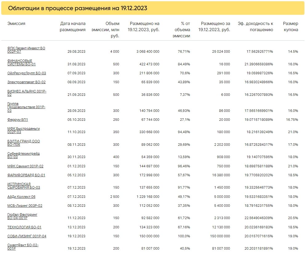 Коротко о торгах на первичном рынке 19 декабря прошло размещение трехлетнего выпуска Соби-Лизинг-001P-04 объемом 150 млн рублей. Ставка купона установлена на уровне 19% (эмитент принял решение увеличить размер ставки с ранее предложенных 17,5% годовых на весь период обращения). Выпуск был размещен за 1 277 сделок, максимальный объем составил 13,4 млн рублей. Основное количество сделок (1 099 шт.) — до 100 тыс. рублей. Медиана — 17 тыс. рублей, наиболее популярная заявка — 1 тыс. рублей. Также вчера началось размещение второго выпуска компании «СМАРТФАКТ» (SmartFact), получившей в октябре рейтинг на уровне «BB-». Ставка купона облигаций серии 02-001P установлена на уровне 19% годовых. Инвесторов смущает наличие call-опциона, который запланирован в даты окончания 4-го и 8-го купонов. В первый день размещения эмитенту удалось разместить облигаций на сумму 81 млн рублей из 200 млн предложенных (40%). Из 705 сделок максимальная составила 50 млн рублей. Основное количество сделок (449 шт.)