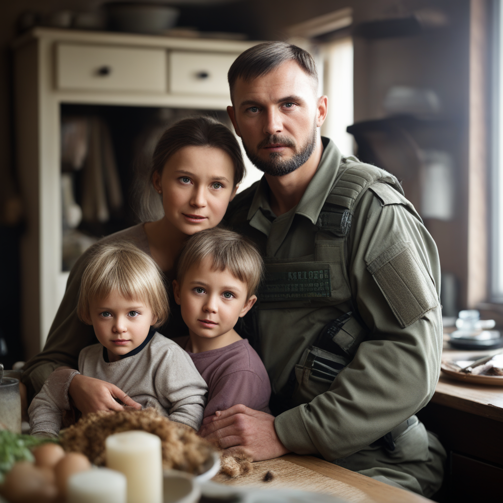 Утренний воздух был свежим, предвестником наступающей осени, когда семья Рудаковых стояла, сбившись в кучу возле своего скромного дома. Роман, одетый в униформу, которая казалась ему слишком большой, смотрел на невинные лица своих детей. Его сын, пятилетний мальчик с глазами матери, сдерживал слезы с храбростью, противоречащей его годам, в то время как его трехлетняя дочь цеплялась за его ногу, ее рыдания пронзительно контрастировали со стоической тишиной рассвета.
