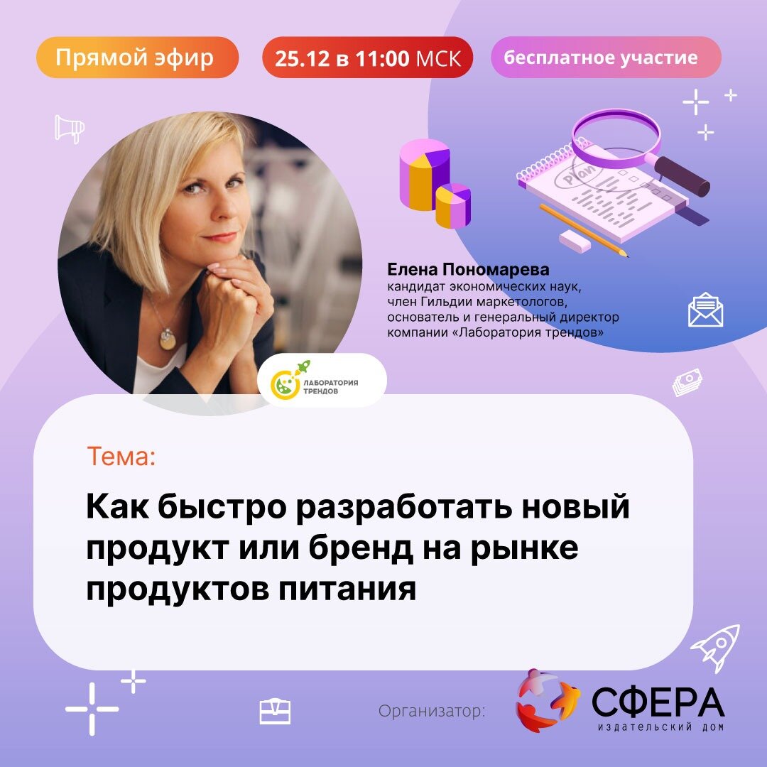 Вы готовы узнать секреты быстрого запуска продуктов питания на рынок? 25 декабря, время: 11:00 МСК состоится эксклюзивный вебинар «Как быстро разработать новый продукт или бренд на рынке продуктов питания». Приглашаем к участию предпринимателей, маркетологов, бренд-менеджеров и других профильных специалистов из сферы создания продуктов питания. На прямом эфире с Еленой Пономаревой — признанным экспертом в области брендинга и маркетинга, вы узнаете, как грамотно обозначить позиционирование, выделить конкурентные преимущества, и эффективно работать с дизайнерами для создания упаковки, которая привлечет внимание потребителей к вашему товару. Елена Пономарева — к. э. н., член Гильдии Маркетологов, основатель и генеральный директор компании «Лаборатория трендов», председатель комитета по маркетингу и стратегическому развитию ЛОТПП, эксперт в сфере маркетинга, стратегического развития и трендвотчинга Для многих участников это будет отличный шанс преобразовать понравившуюся идею в успешный п