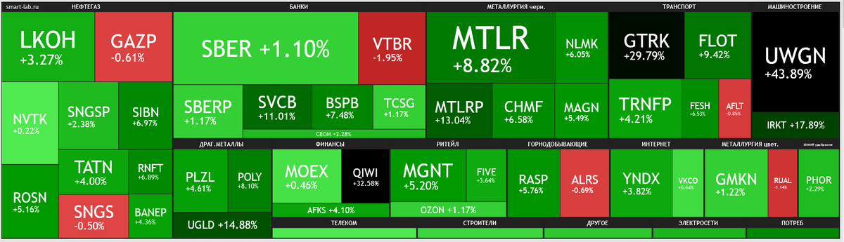 Наконец-то мы дождались что тепловая карта индекса Московской биржи вся такая зеленая-зеленая, глаз радуется и оторваться не может. Долго мы этого ждали, скажем честно, не все инвесторы смогли досидеть в акциях и ушли, но это их дело. А все дело в том, что биржа - это рынок, непредсказуемый и коварный на котором очень часто прекращают работать даже самые очевидные зависимости. Рассказываю. Не нужны мне депозиты под 16% Многие вышли из акций потому, что их поманили депозиты с высокими ставками и облигации с большой доходностью к погашению. Я понимаю людей, они за 3-4 месяца могут получить доходность 16% годовых - это привлекает инвесторов. Но что такое 16%? По сути это эквивалентно +5.3% роста акции за 4 месяца, а точнее не менее +5.9%, ведь если купить-продать актив, то придется заплатить НДФЛ и комиссии за сделки. Или это +3.2% за 2 месяца, но далеко не все активы за предыдущие 2 месяца показали такой рост, вот инвесторы и разочаровались. Вот она простая арифметика, которая заставил