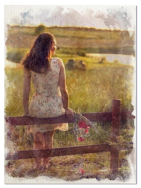 Варя плела себе венок из полевых цветов, а молодой человек, который приехал из города, сидел рядом и смотрел на неё.